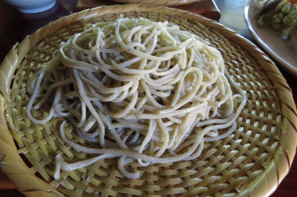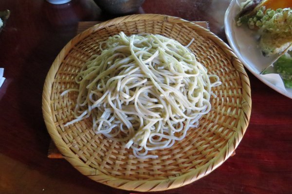 更級でそばの殻を取り除いて挽いたそば粉。「深里」は挽きぐるみのそば殻を一緒に挽いたそば粉の2種類。「蛍の緑」は新そばの季節は鮮やかな緑色。そば殻なしなのですっきりとしたのどごし。深里も注文して食べ比べてみたが、確かに