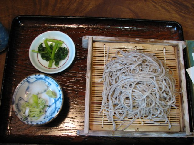 4)薬味;わさび、大根おろし、ねぎ。蕎麦徳利と蕎麦猪口はセンスもよい。