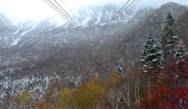 10/28;北ア「乗鞍岳」の冷泉より上部は初雪が積もった。乗鞍エコーライン・乗鞍スカイラインは着雪・凍結で全線通行止。