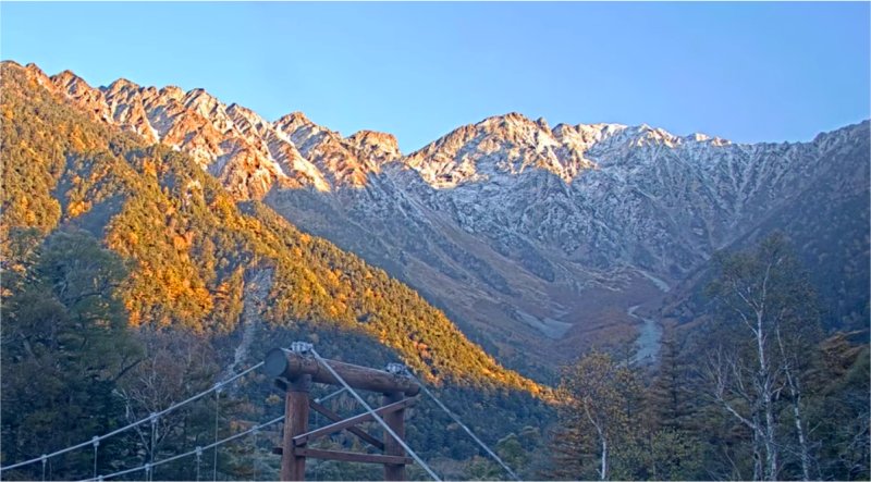 「初冠雪の穂高連峰」(2025.10.29;五千尺H(上高地) liva cam)