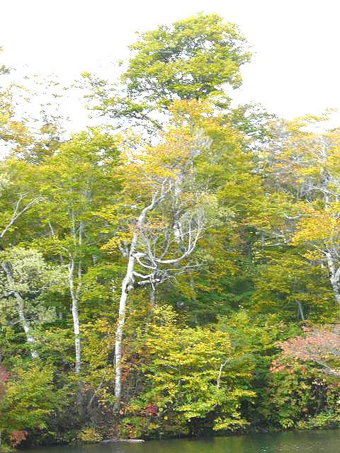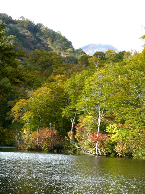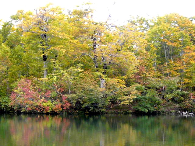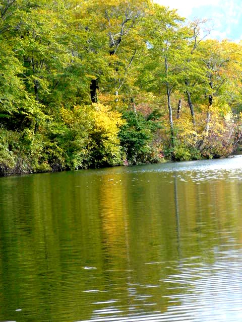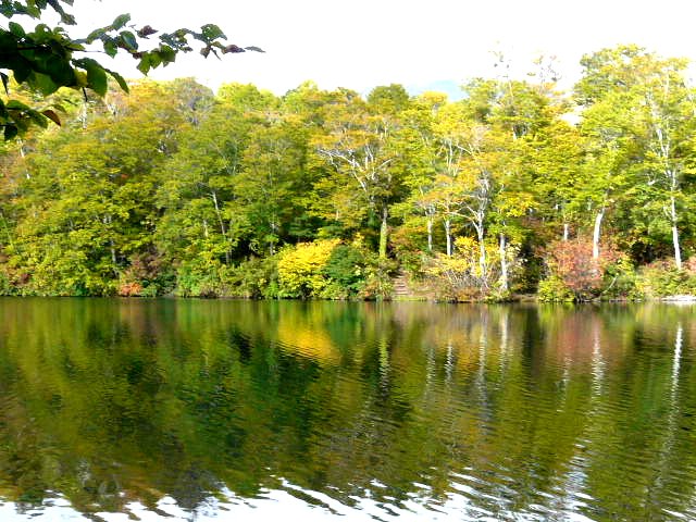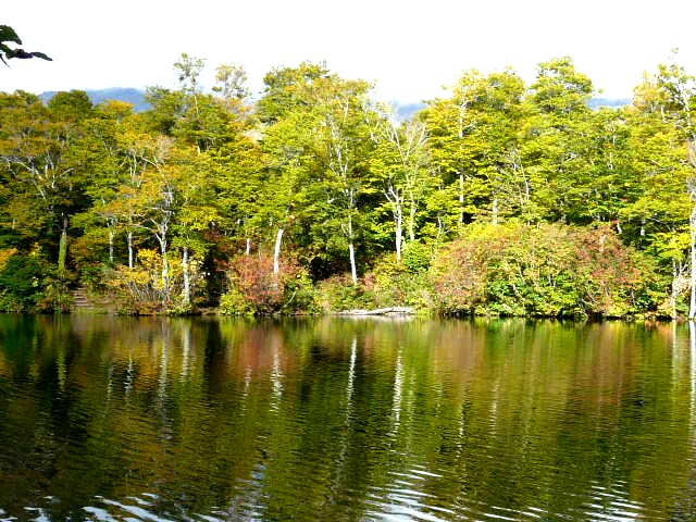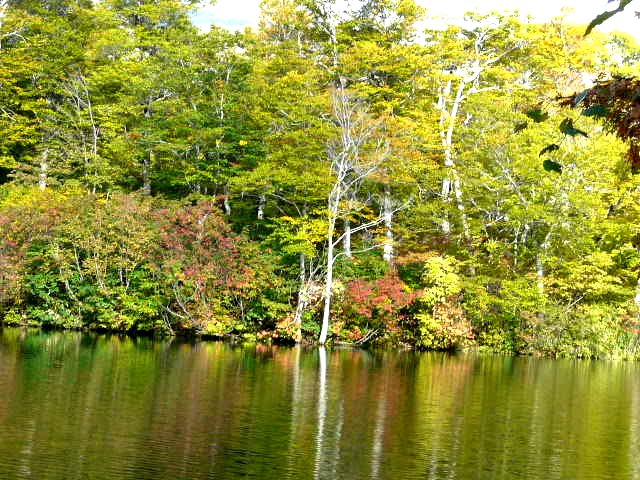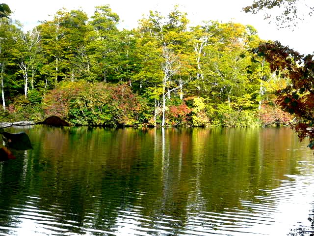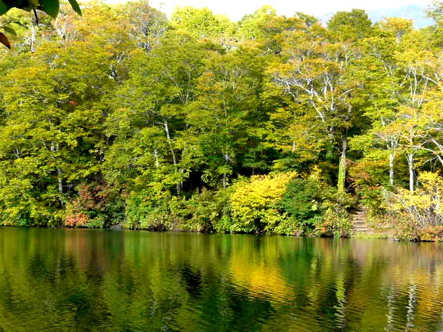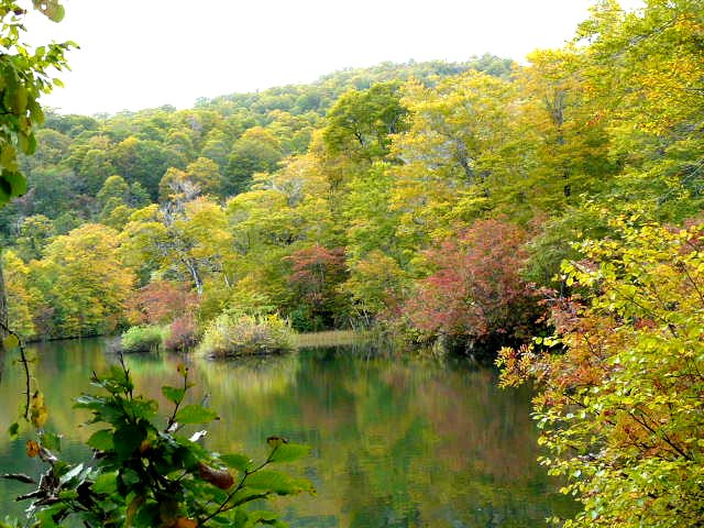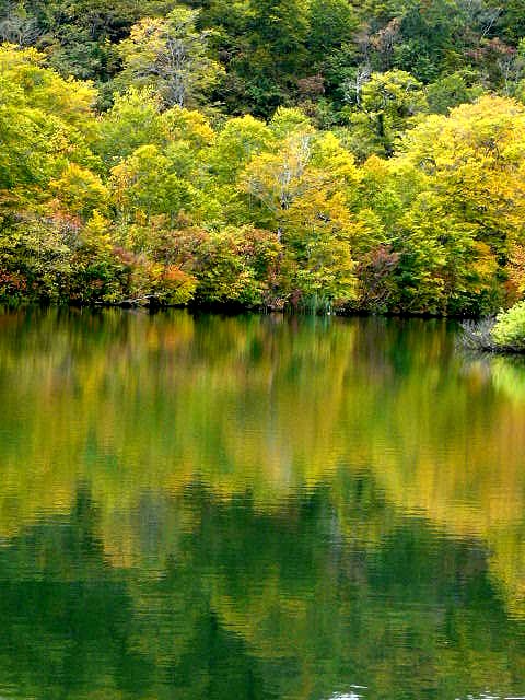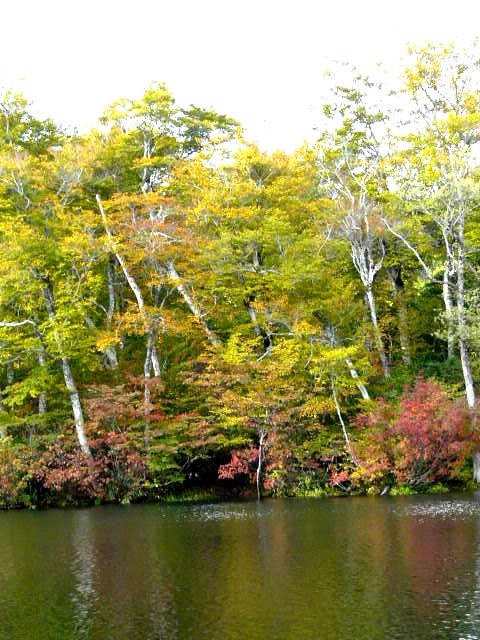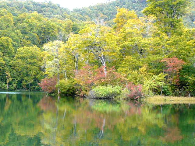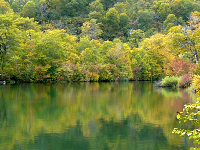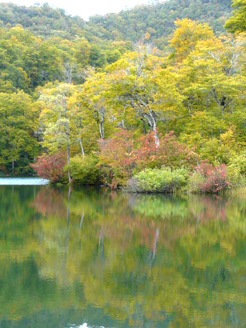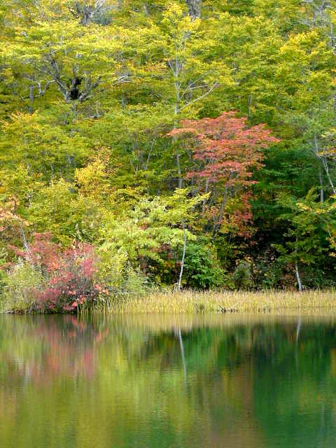 「鎌池」は紅葉の見頃を迎え、紅葉のピークは来週。ここ数日間で冷え込みが強まり、色付きが進んだ。池を囲むブナ林やナナカマドが赤や黄に紅葉。雨飾高原や鎌池周辺はブナ林が多く、赤よりも黄色が多い。