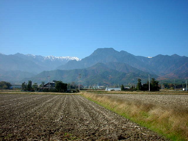 ■晩秋の松川村。「有明山」の背後に聳える北アの峰々が雪化粧した。