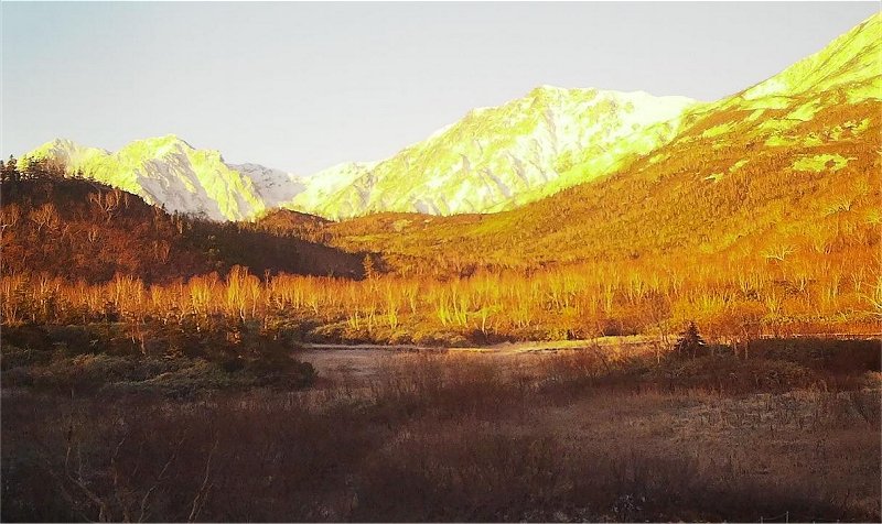 冠雪した穂高連峰の下、梓川河畔では陽光を受けて輝くカラマツが観られた。11/15;「上高地閉山式」が開かれます。