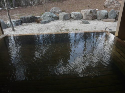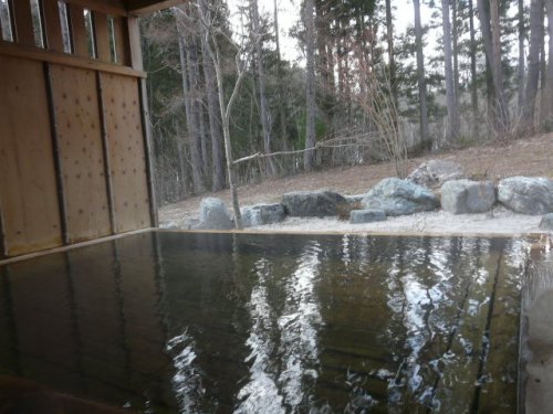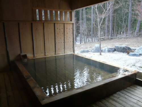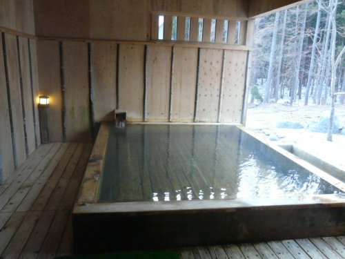 江戸時代の古民家を移築した浴場で、湯治場を思わせる半露天風呂。湯船の広さは3m×4mと小さめ。ボディーソープ、シャンプー、リンスなど常備。ロッカー・ドライヤなど脱衣所あり。温泉は「白馬みずばしょう温泉」で源泉100%かけ流し。