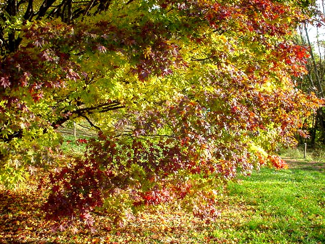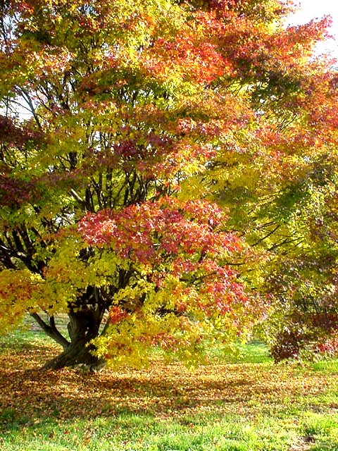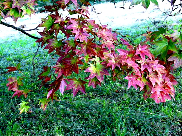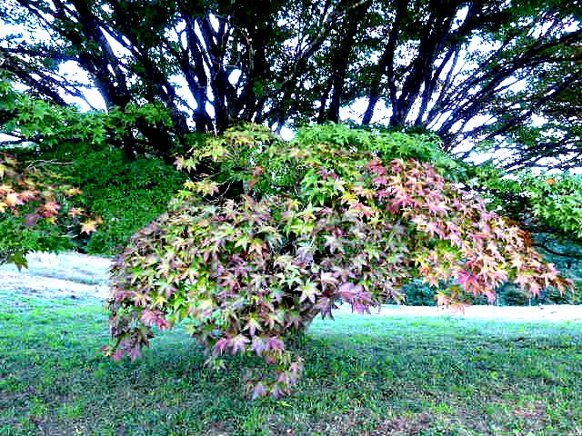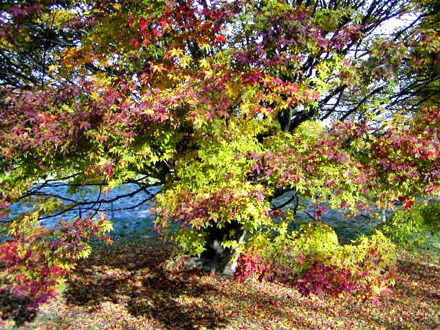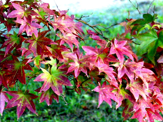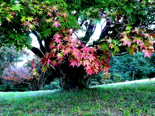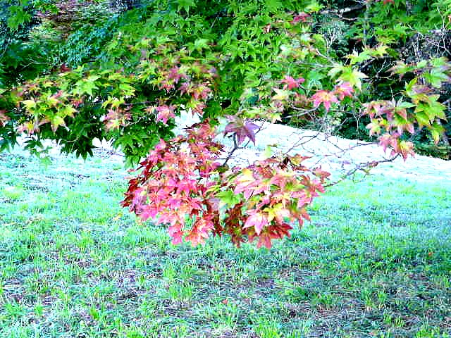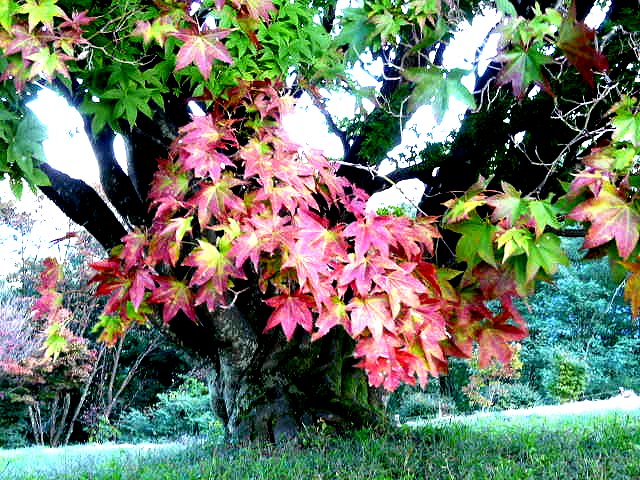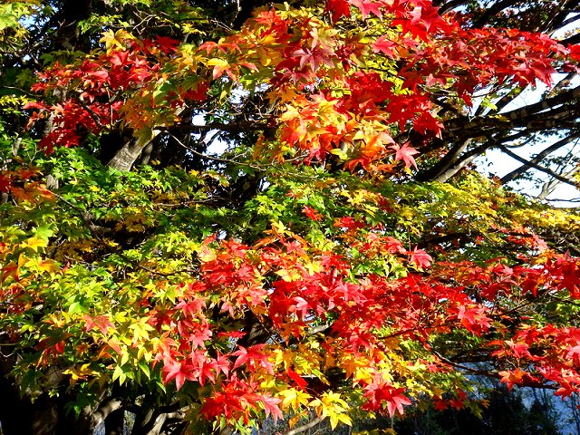 カエデやツツジの紅、朱、黄色、黄色などが綾をなし、本堂や庫裏、山門を染めています。ドウダンツツジの赤が鮮やか。