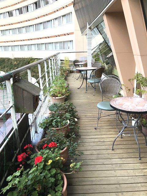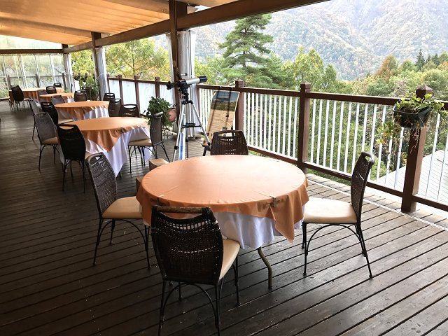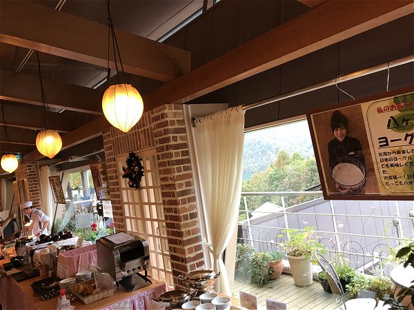 朝食はフロント前のレストランでテラス席、山が見渡せて癒される。焼きたてのクロワッサンがおいしい。