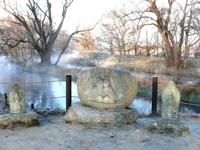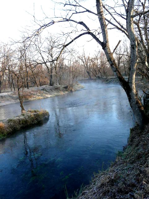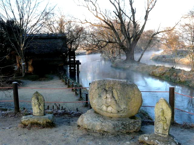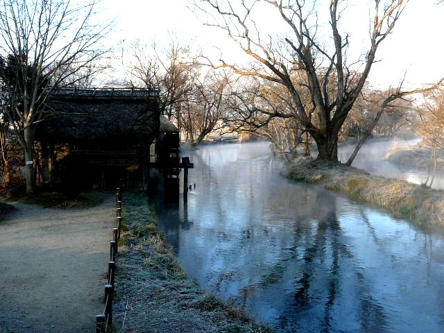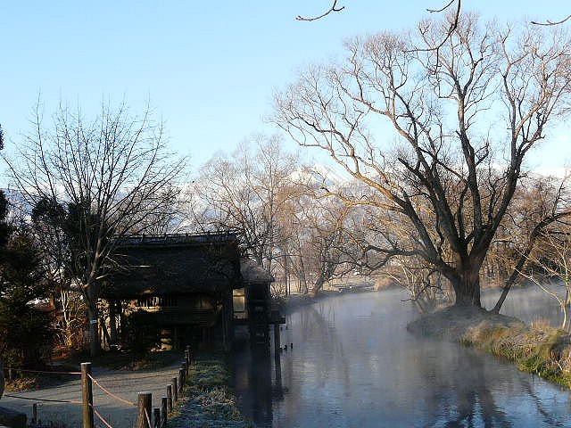 雄大な常念岳山麓の安曇野では、12/初;冬の晴れて冷え込んだ朝に、「大王わさび農場」付近の水車小屋のある「蓼川」や「万水川」、「わさび田」では「川霧」が発生する。川から白い霧がもくもくと湧き出ている。