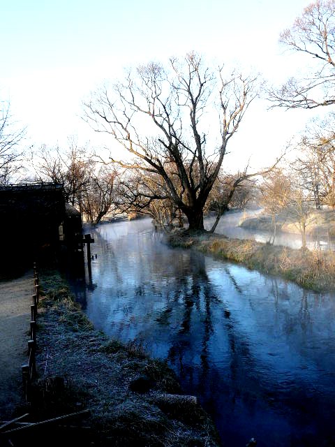 「水車小屋と蓼川・万水川の川霧」(12/初;安曇野にて)