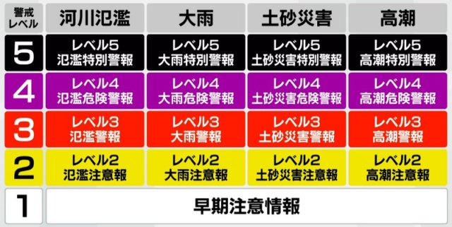 ・分類は「氾濫」「大雨」「土砂災害」「高潮」の4つ。警戒レベルは高い順に「レベル5」(特別警報)から「レベル2」(注意報)に名称変更。レベル1(早期注意情報)