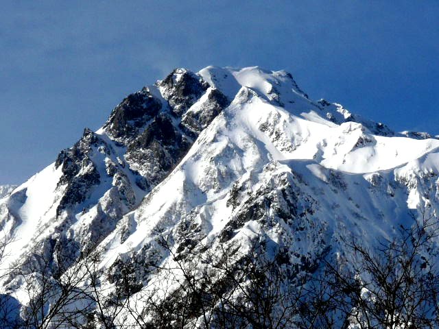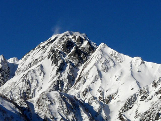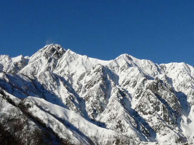 実は初冬(11/下-12/初)には「五龍岳」に雪が積もり、「武田菱」が見られます。積雪が増えるとこの紋様は雪に埋もれて消えていきます。