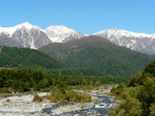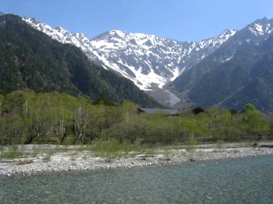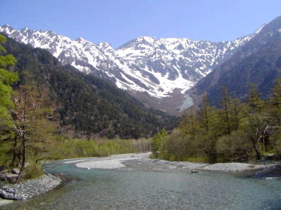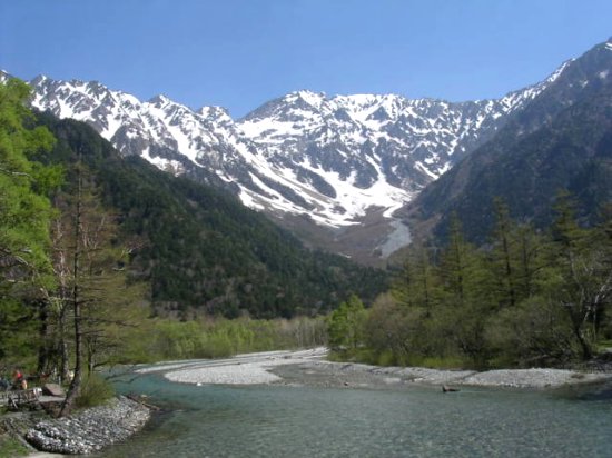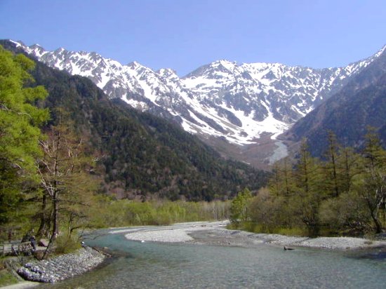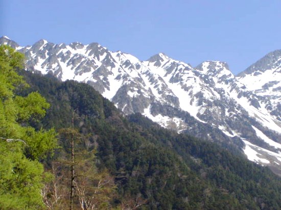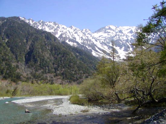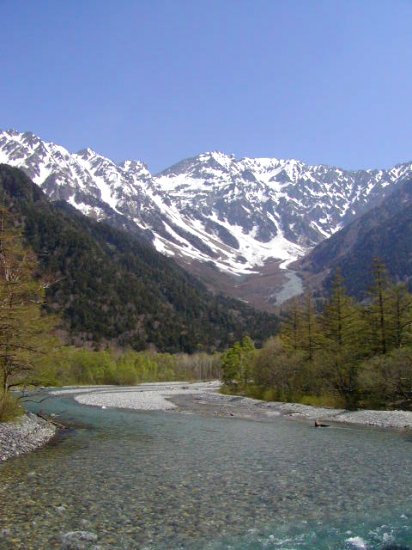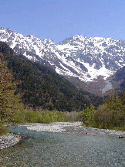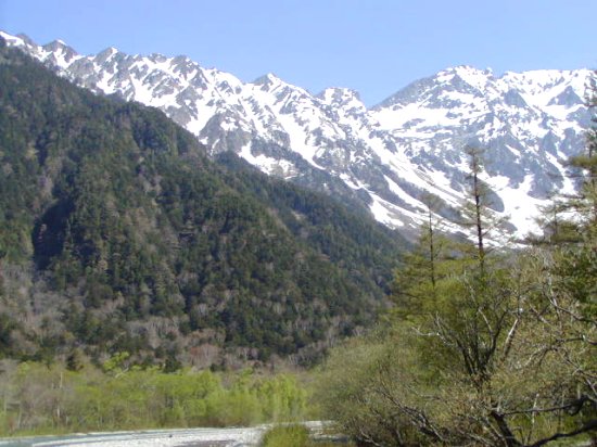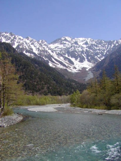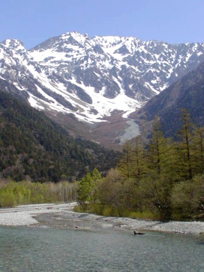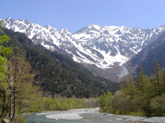 「残雪の穂高連峰」(初夏の上高地・梓川にて」(2011.06.04)