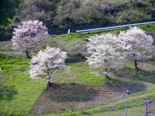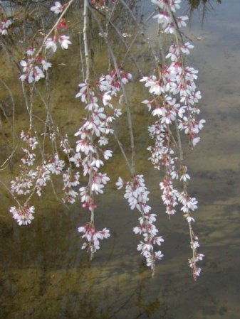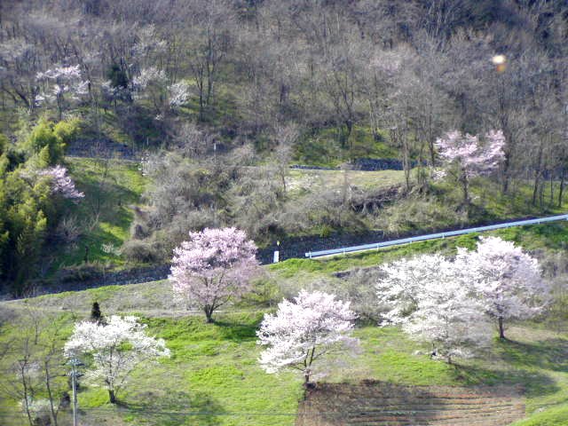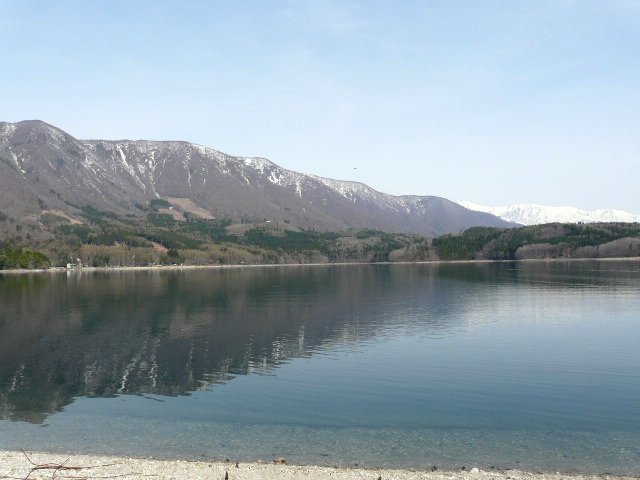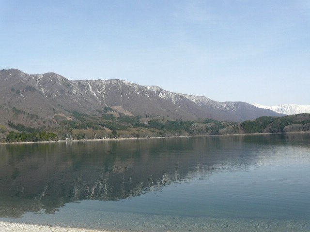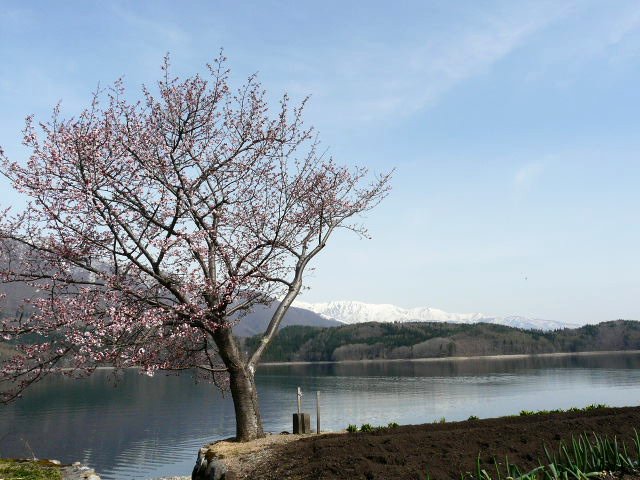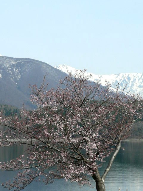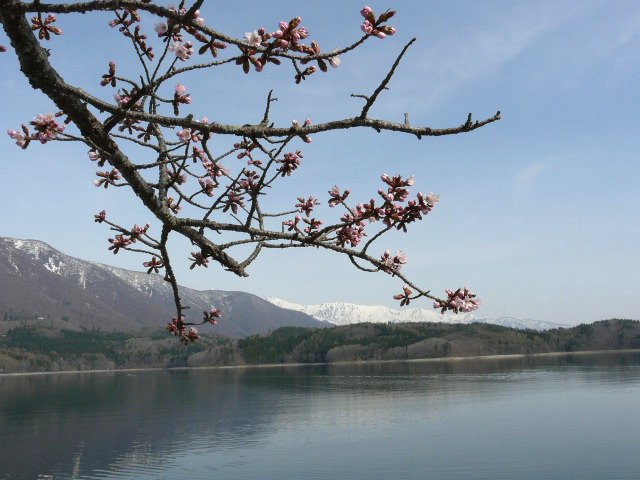 「春の訪れ・咲き始めた青木湖の桜」(4/上;青木湖にて)