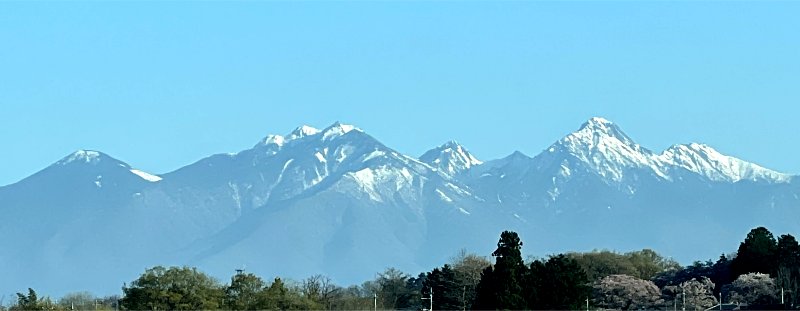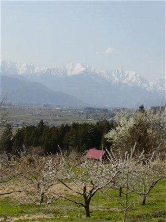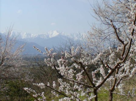 「白梅と常念岳〜東天井岳・大天井岳」(安曇野・大王わさび農場にて)