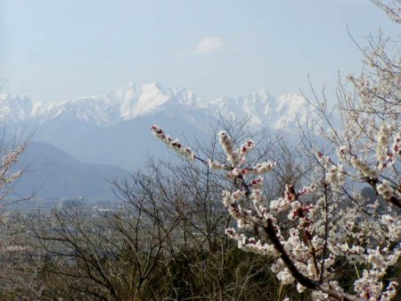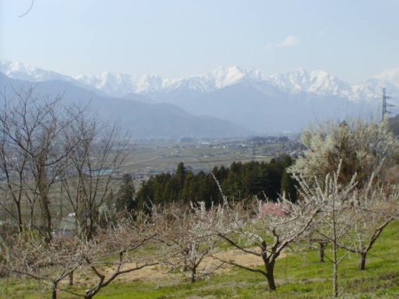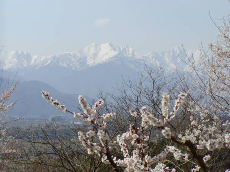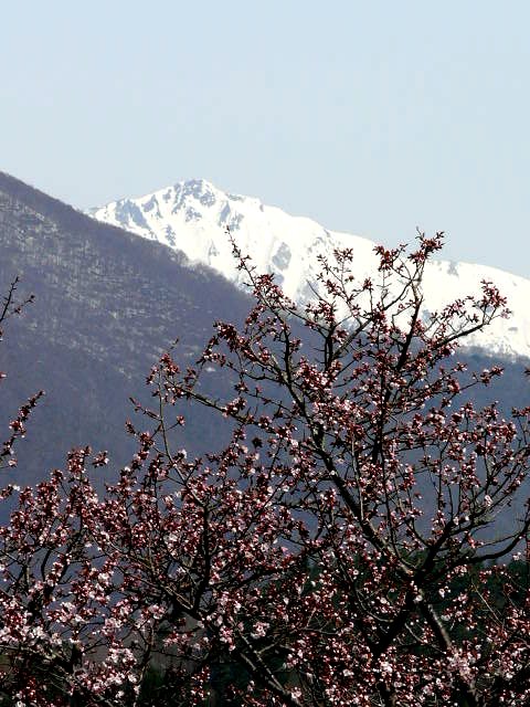 梅の花と爺ヶ岳、鹿島槍ヶ岳(池田町にて)