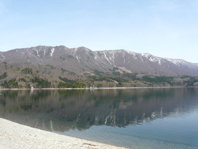 「残雪の乗鞍岳と牛留池」(5/上:乗鞍高原・休暇村にて)