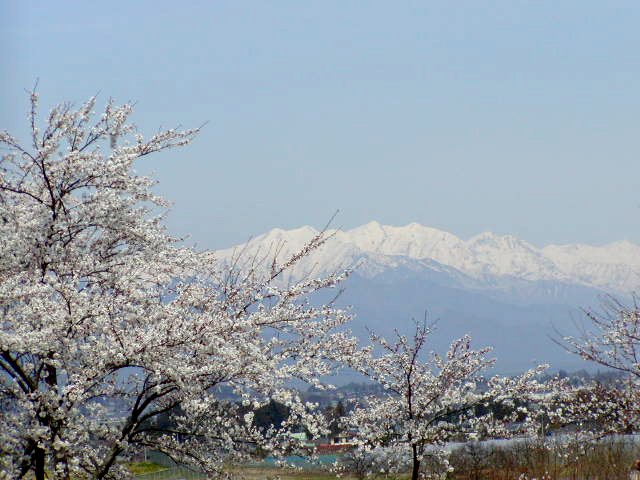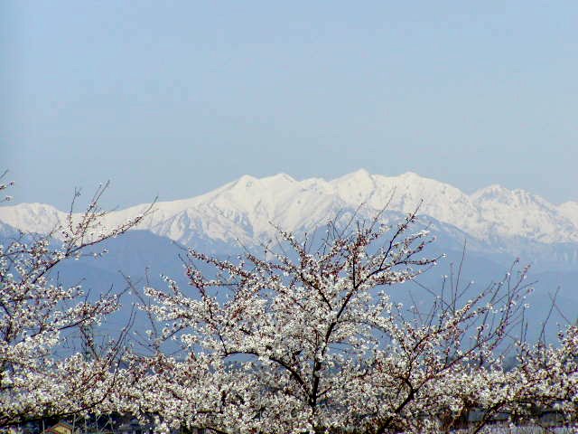 「桜と爺ヶ岳・鹿島槍ヶ岳・五龍岳」(大町観光道路にて)