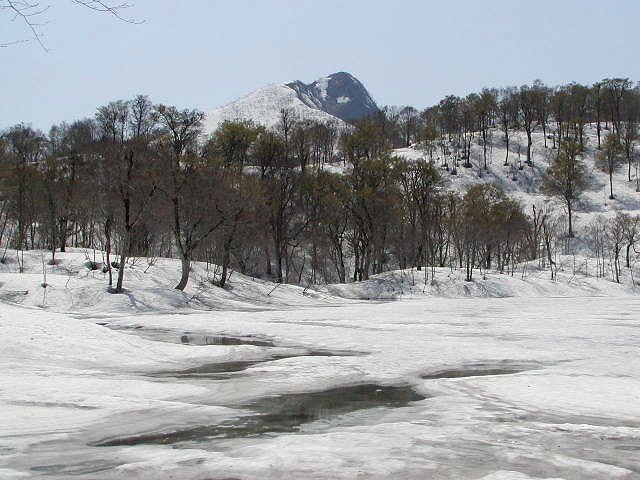 「雪解けの春の鎌池と残雪の大渚山」(雨飾・鎌池にて)