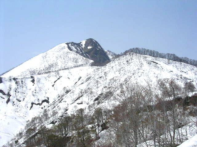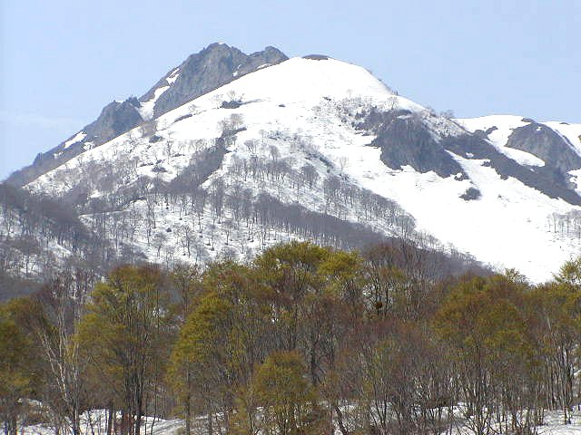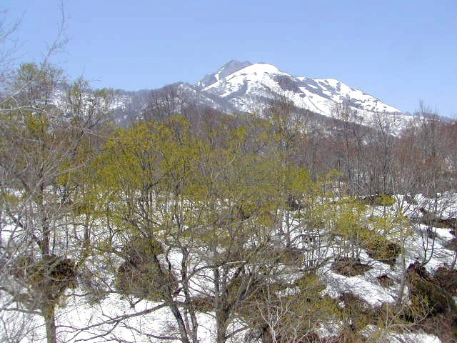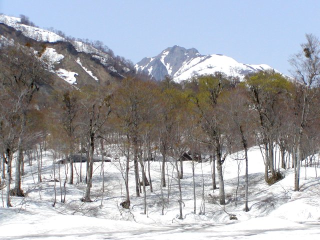 「ブナの芽吹きと残雪の雨飾山」(つぶれ池にて)