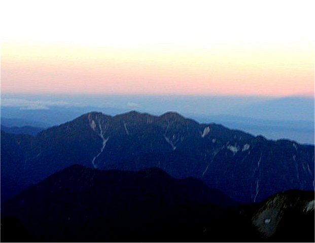 「夜明けの槍ヶ岳・穂高連峰」(樅沢岳にて)