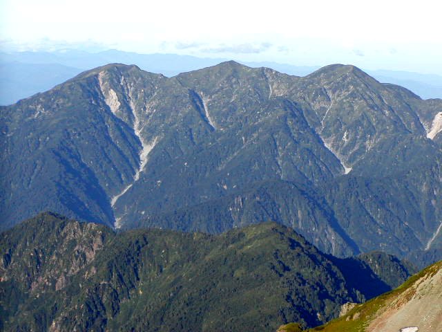 手前は蓮華岳、岩小屋沢岳の稜線、牛首尾根と牛首山、手前は天狗尾根」(白馬鑓ヶ岳山頂にて)