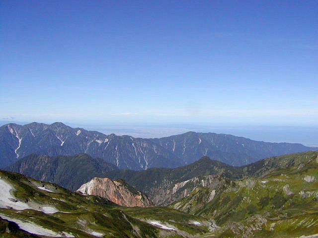 「初秋の毛勝三山と越中駒ヶ岳・僧ヶ岳、手前には名剣山・百貫山〜不帰岳、奥には富山湾・能登半島」(白馬鑓ヶ岳山頂にて)