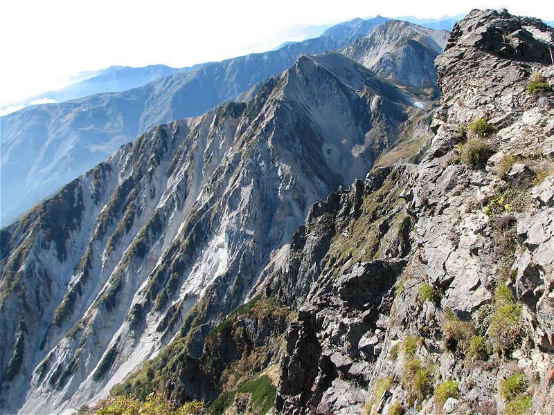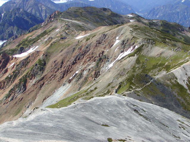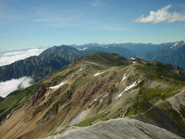 手前は赤沢山・西岳・喜作新道・赤石岳の稜線」(常念岳にて)