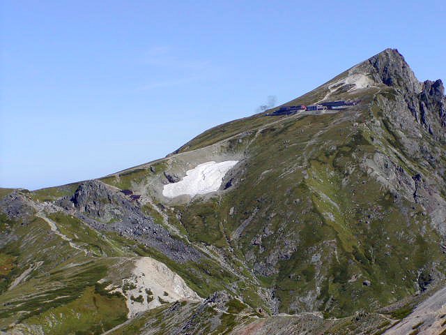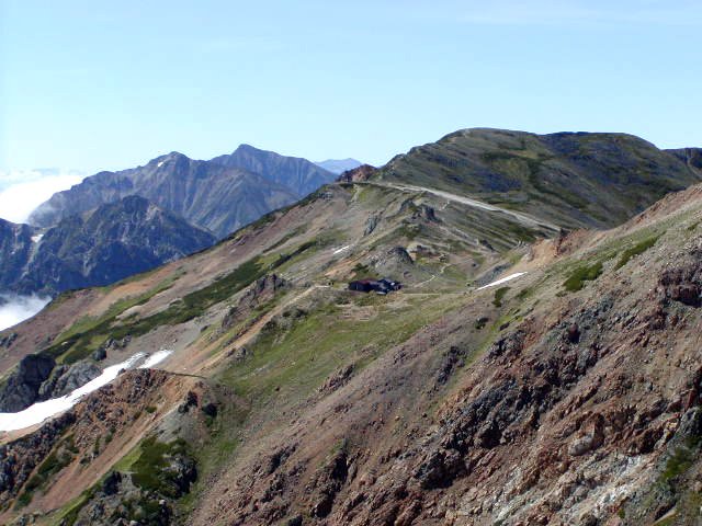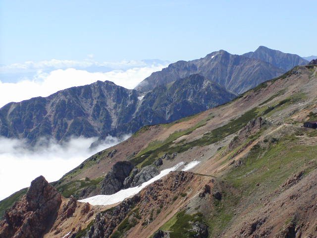 「晩夏の白馬鑓温泉小屋と雪渓、双子尾根と小日向山」