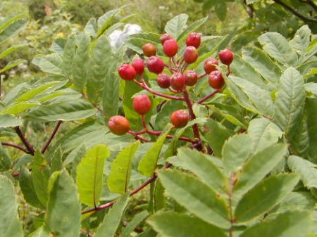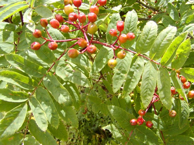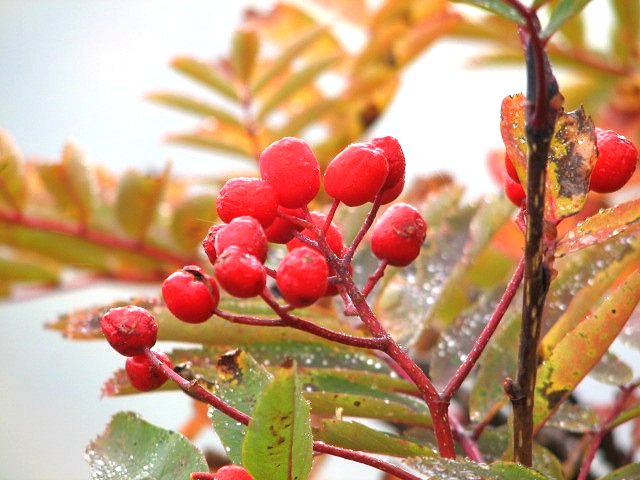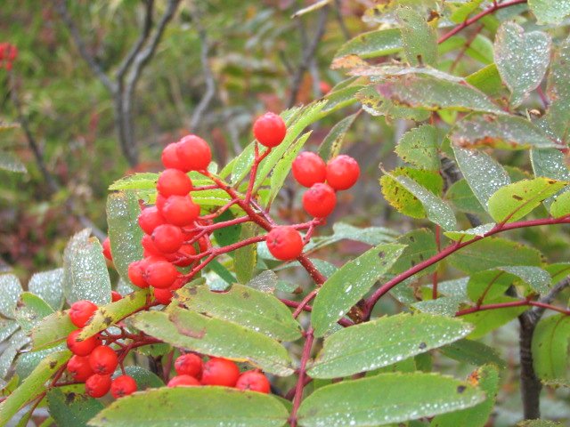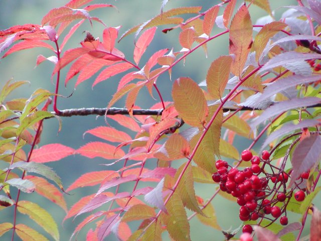 「赤くなり始めたナナカマドの実」)(白馬鑓温泉にて)