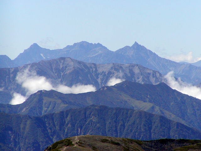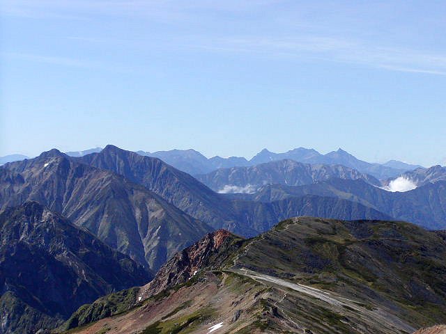 手前は蓮華岳と針ノ木岳、鳴沢岳・赤沢岳の稜線、牛首尾根、手前は白馬鑓ヶ岳」(白馬岳山頂にて)