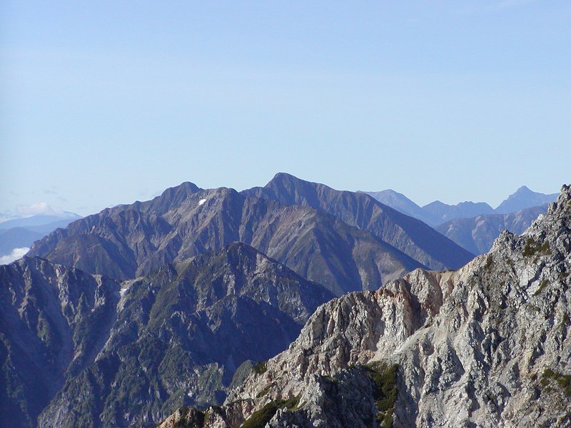 手前に赤沢山・西岳・赤石岳の稜線」(常念岳にて)