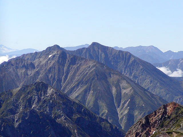 手前は蓮華岳、岩小屋沢岳の稜線、牛首尾根と牛首山、手前は天狗尾根」(白馬鑓ヶ岳山頂にて)