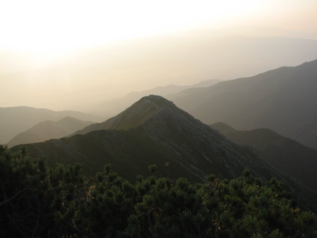 「朝の槍ヶ岳・穂高連峰」(弓折岳にて)