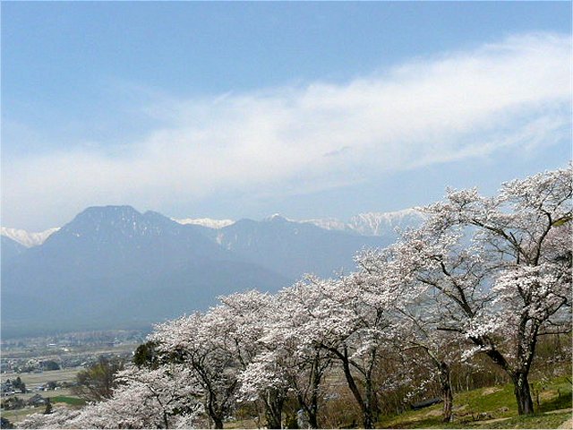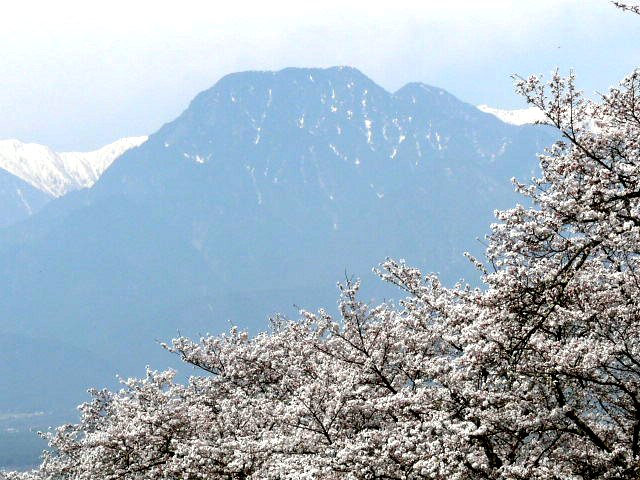 「桜と爺ヶ岳・鹿島槍ヶ岳・五龍岳」(長峰山にて)