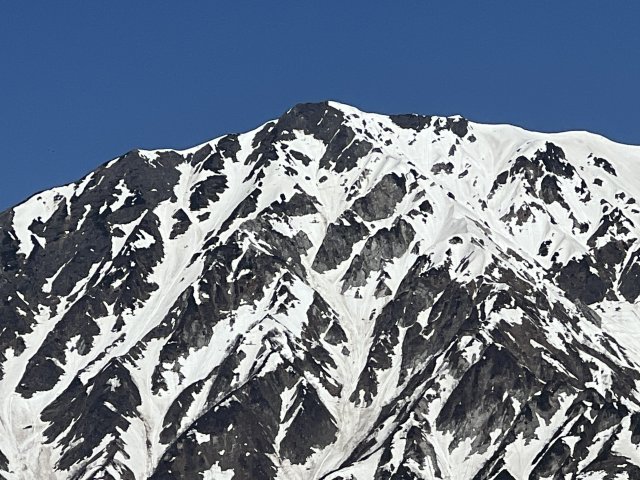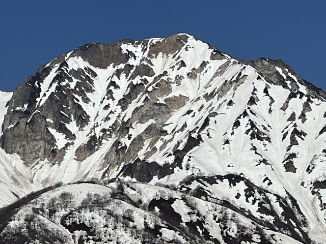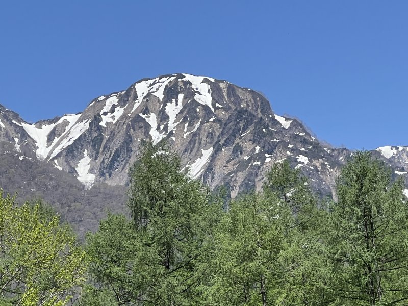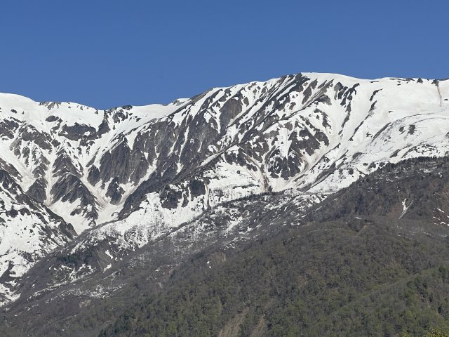 「雪解けの進んだ鹿島槍ヶ岳」(鹿島川にて)