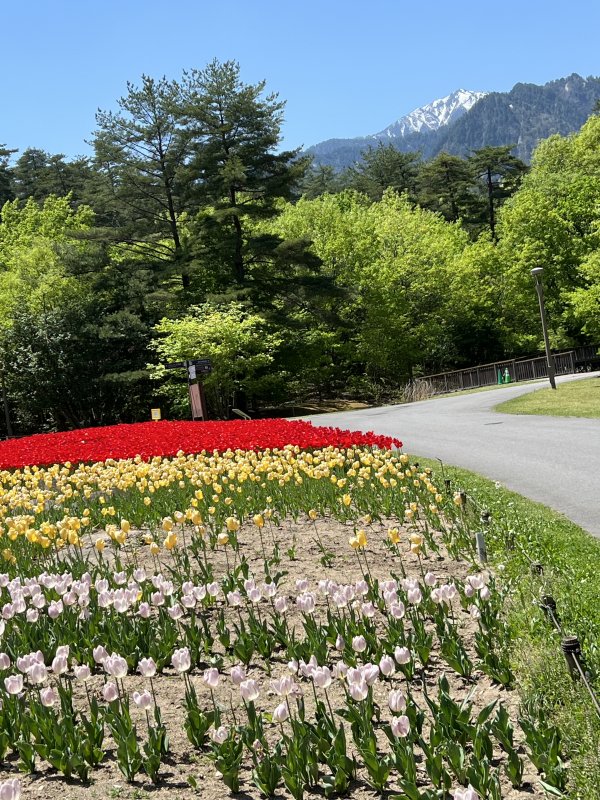 「チューリップと残雪の餓鬼岳」(春のれき原の花畑)(国営アルプスあづみの公園大町・松川地区にて)