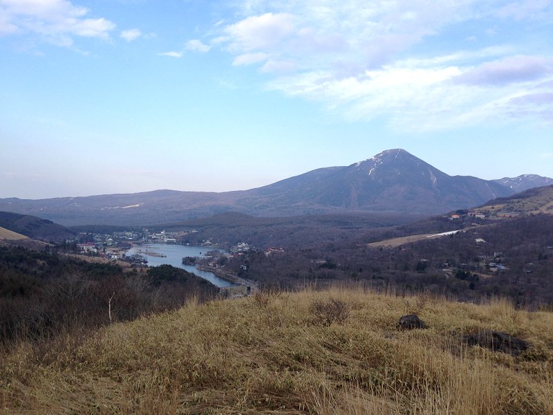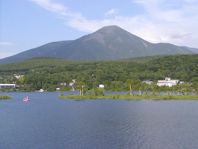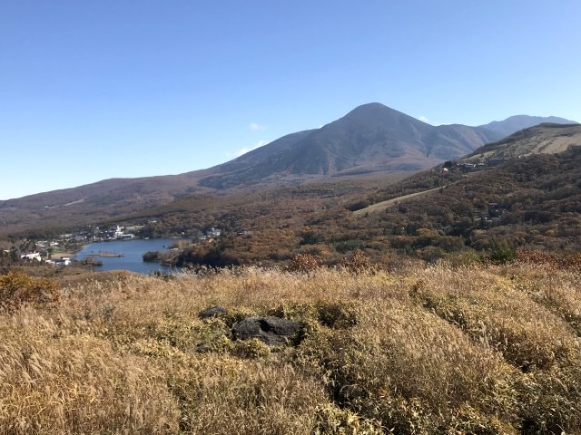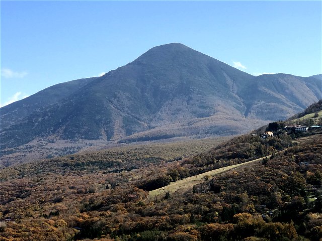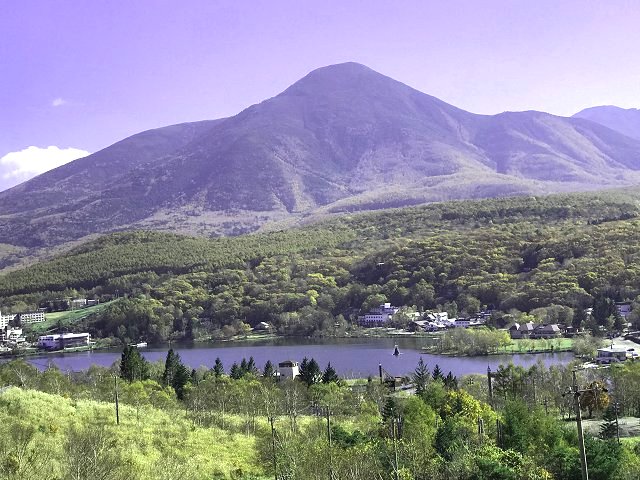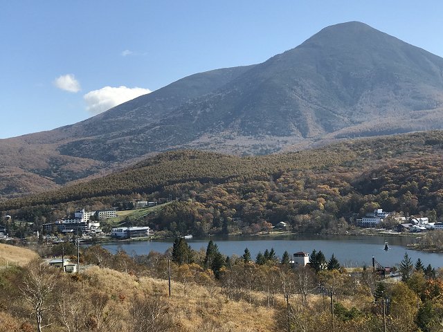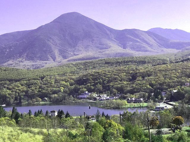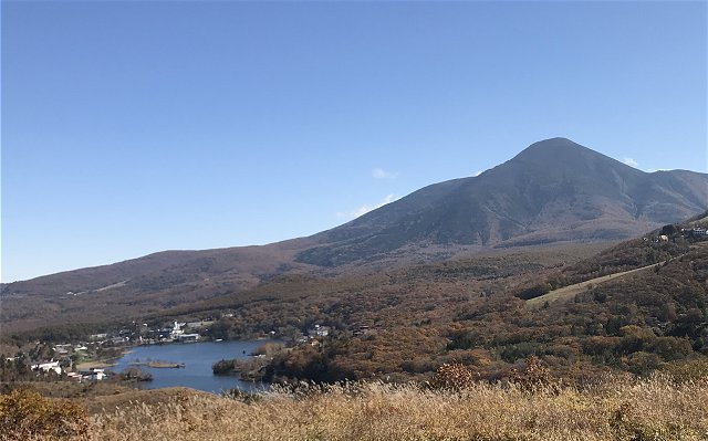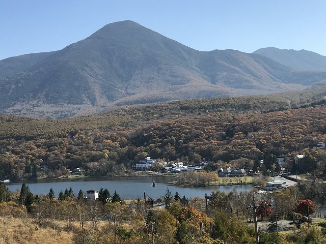 「美しい蓼科山と白樺湖」(霧ヶ峰・車山下白樺湖展望台にて)