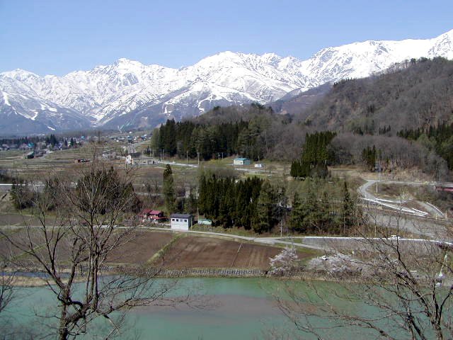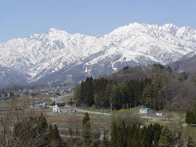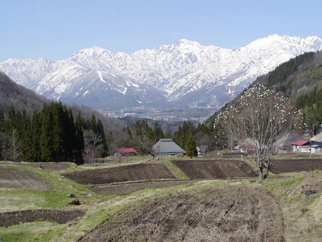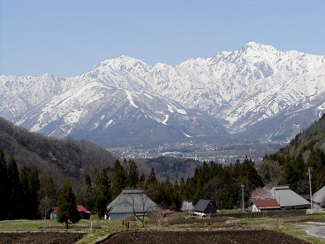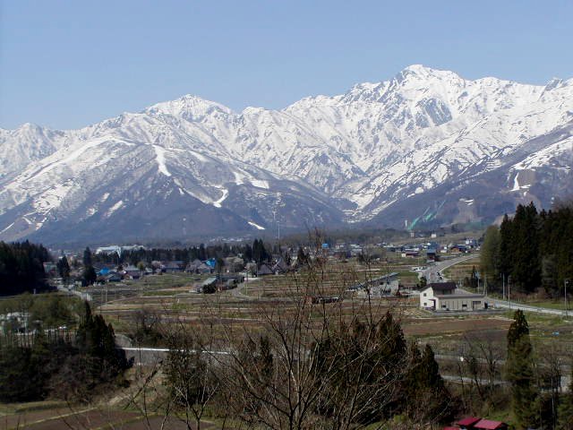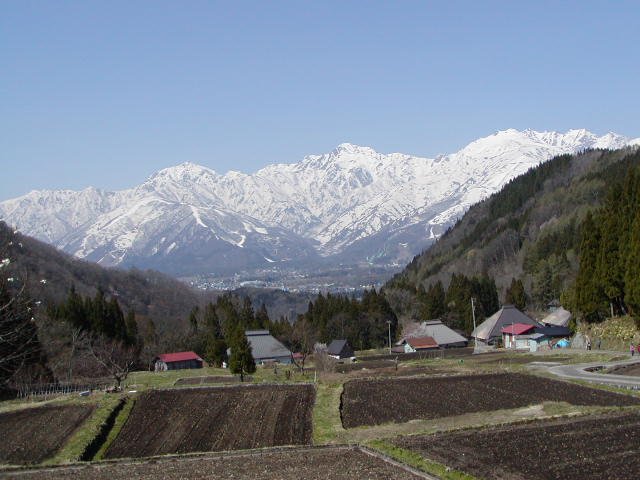 「春の鹿島槍・五竜岳・八方尾根・不帰ノ嶮」(青鬼集落にて)