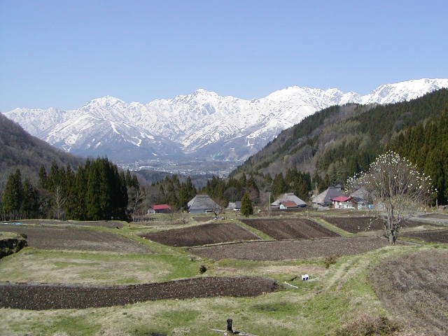 「鹿島槍ヶ岳・五龍岳とこぶし咲く青鬼集落の棚田」(白馬青鬼にて)