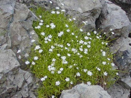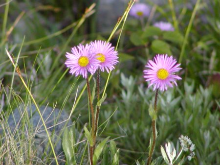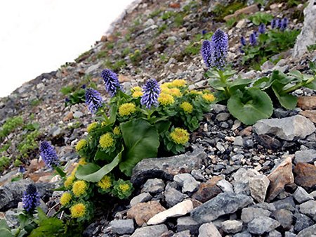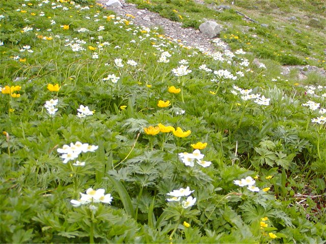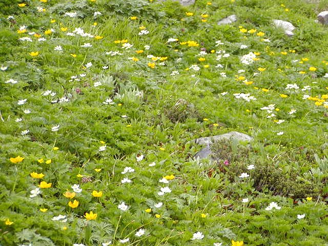 「タカネシオガマ・ミヤマキンバイ・イワギキョウ・タカネツメクサ・シナノキンバイ・ハクサンイチゲなど」(白馬岳頂上宿舎下〜丸山にて)