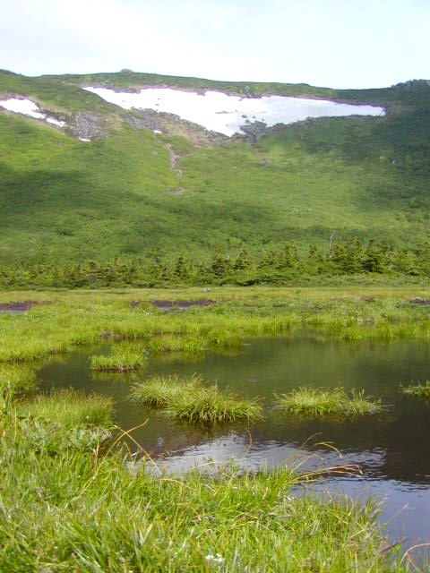 「白馬乗鞍岳(2456m)の雪渓と天狗原(2204m)の池塘」(天狗原にて)