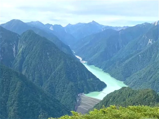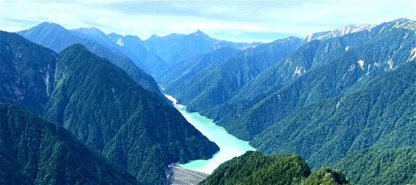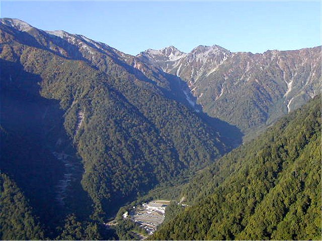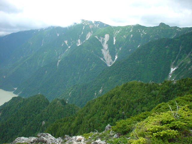 「針ノ木岳・スバリ岳と眼下の扇沢駅」(爺ヶ岳にて)