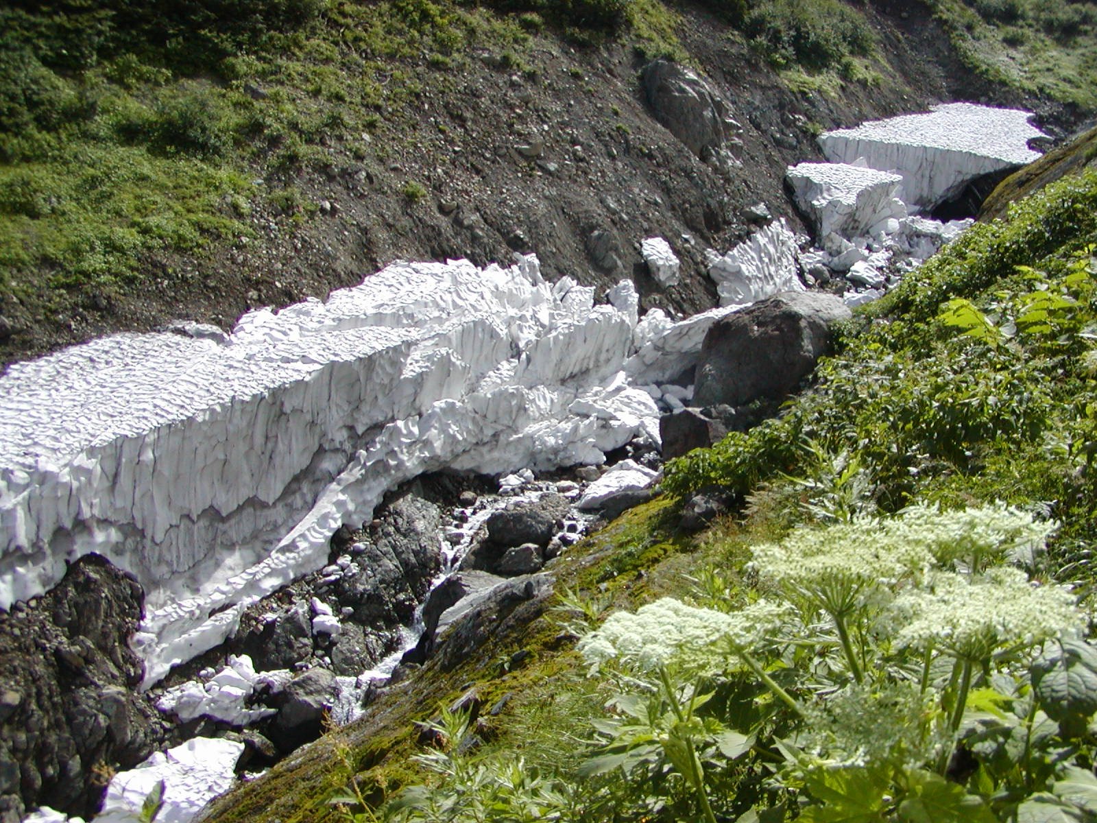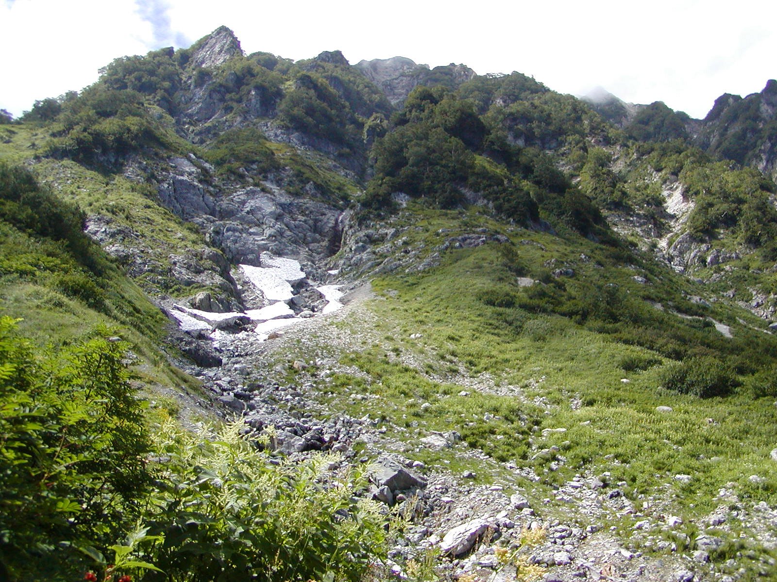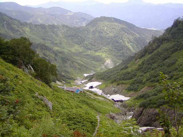 「晩夏の白馬鑓温泉小屋と雪渓、双子尾根と小日向山」