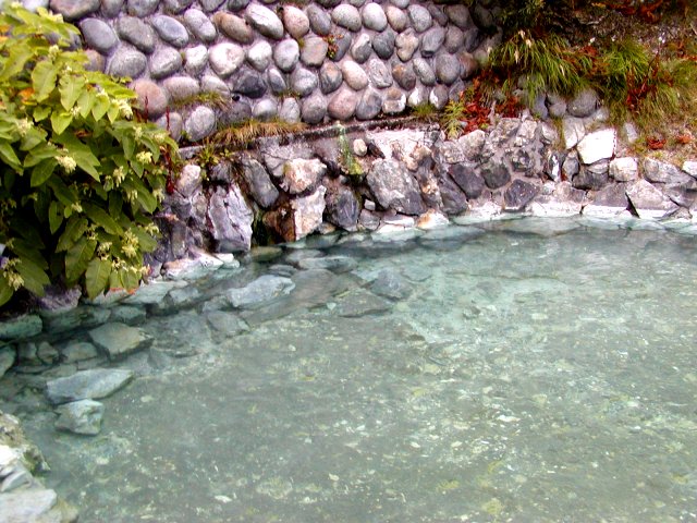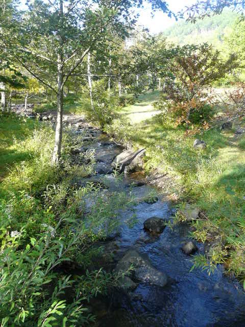 「晩夏の白馬鑓温泉の湯の川とテント場」
