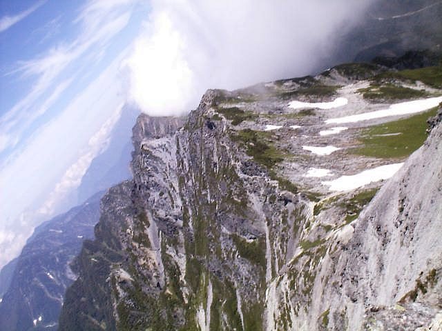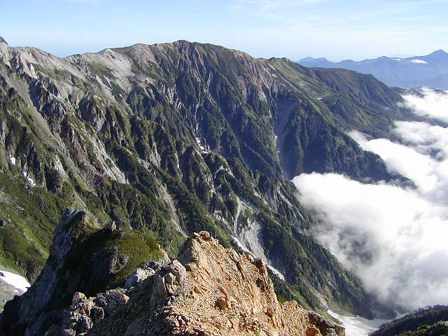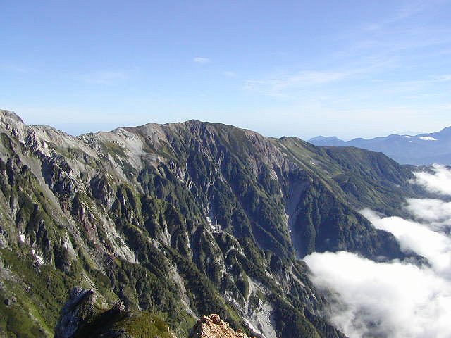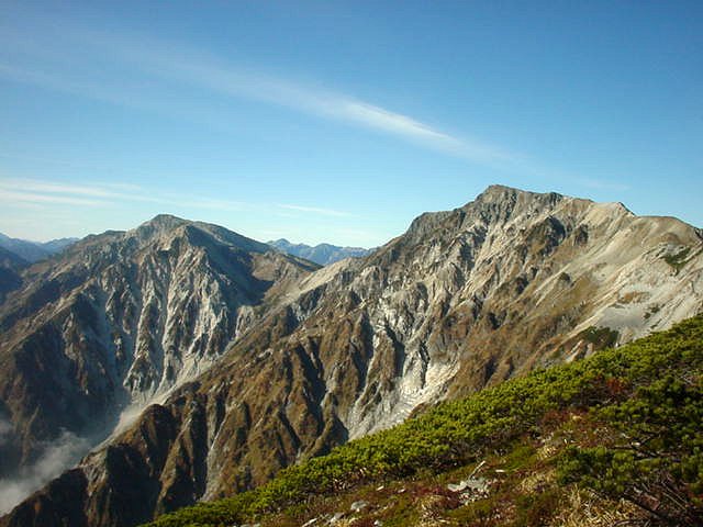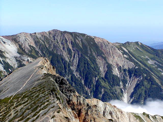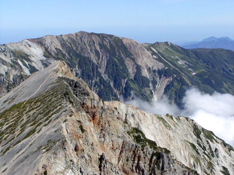 「断崖絶壁の白馬岳、杓子岳・白馬鑓ヶ岳、奥には穂高連峰と槍ヶ岳」(白馬岳山頂にて)