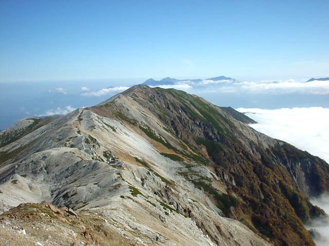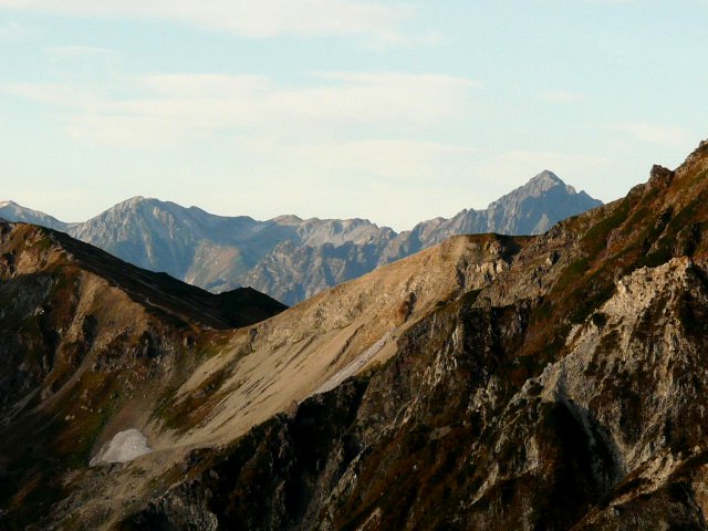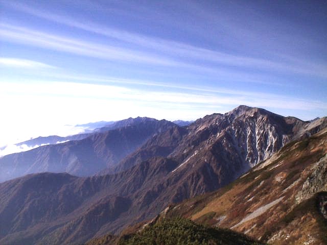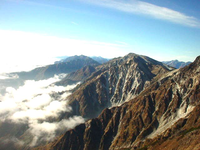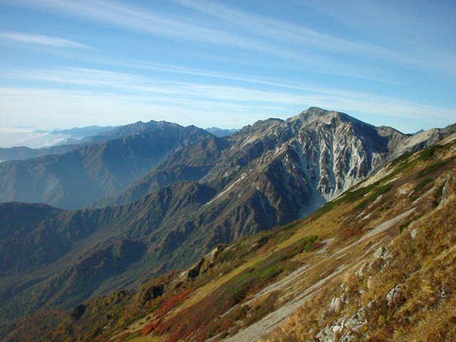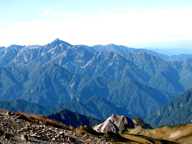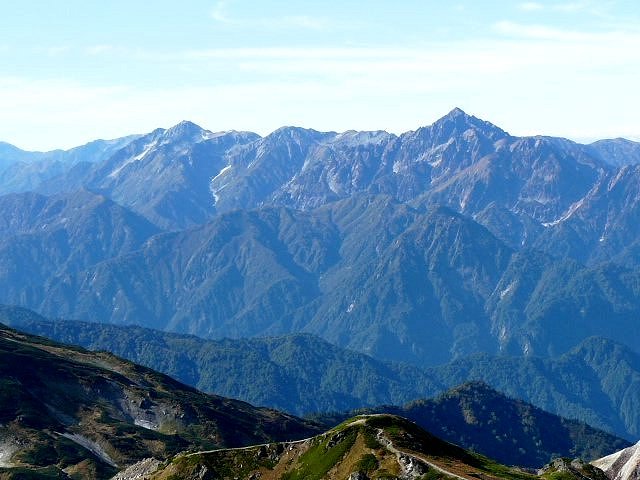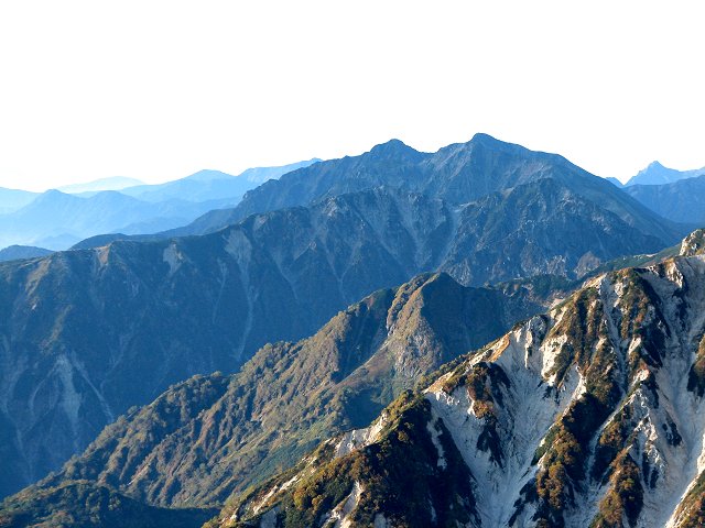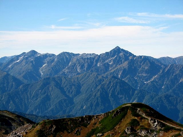 「秋の白馬岳、奥に薬師岳・立山・真砂岳」(小蓮華山〜三国境にて)