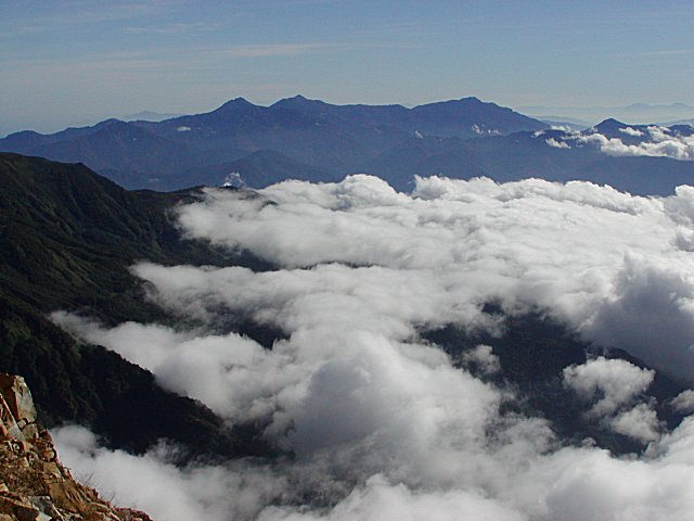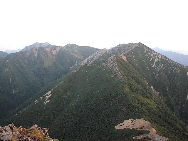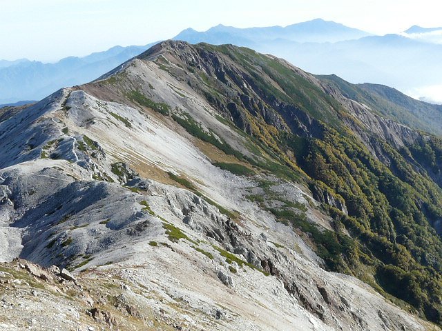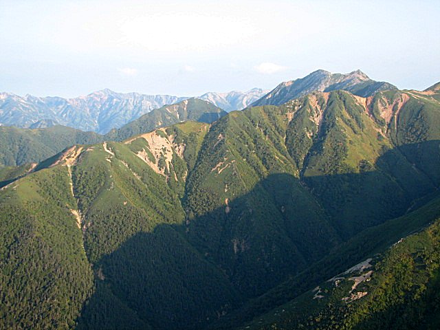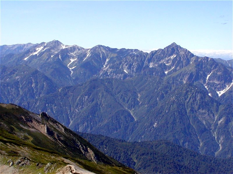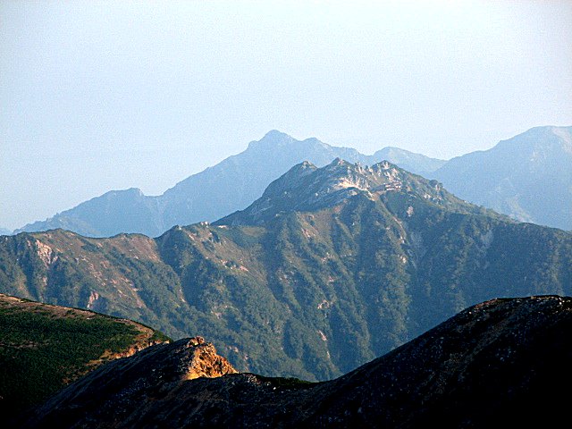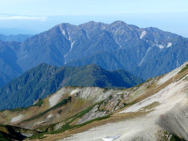 手前に赤沢山・西岳・赤石岳の稜線」(常念岳にて)