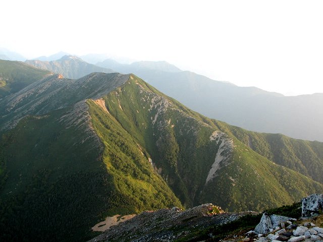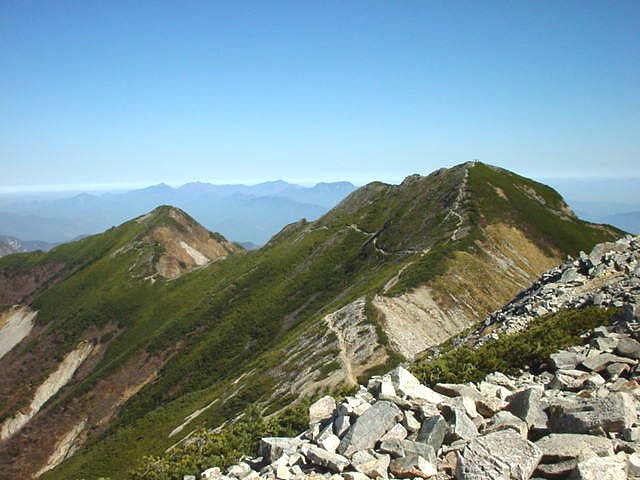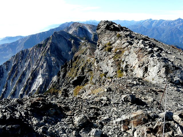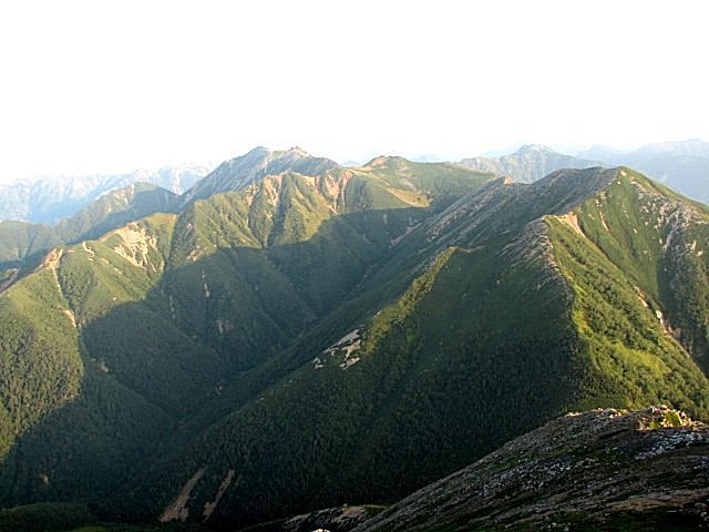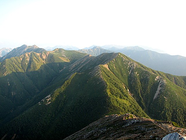 手前は赤沢山・西岳・喜作新道・赤石岳の稜線」(常念岳にて)