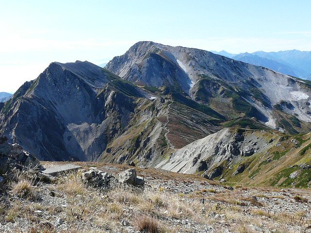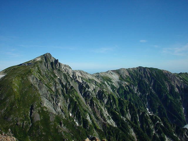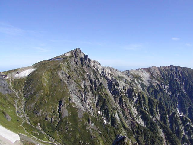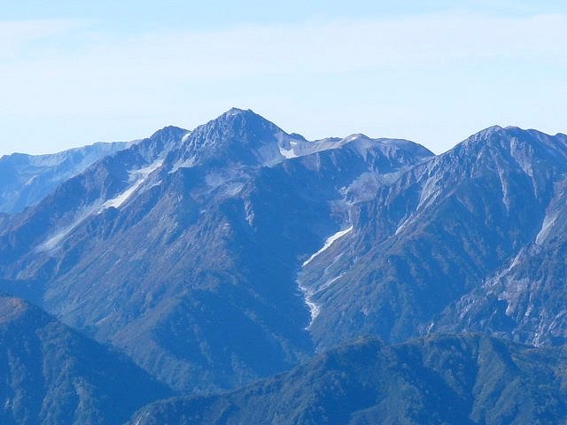 「白馬鑓ヶ岳、手前は杓子岳、左奥に穂高・槍ヶ岳・右奥に劔岳」(杓子岳にて)