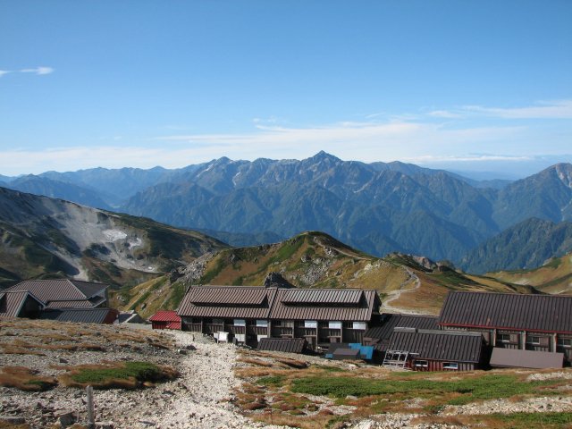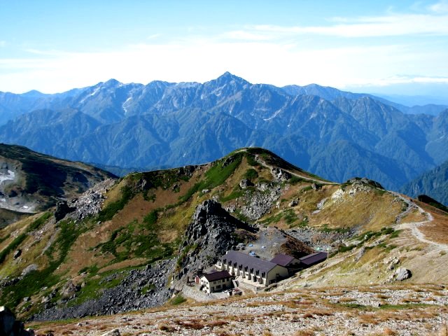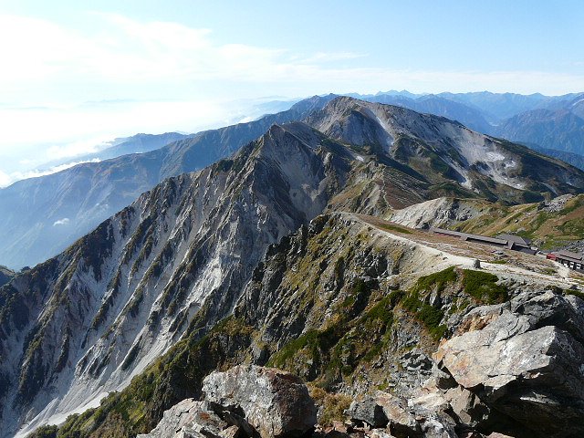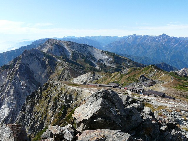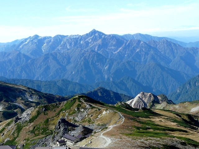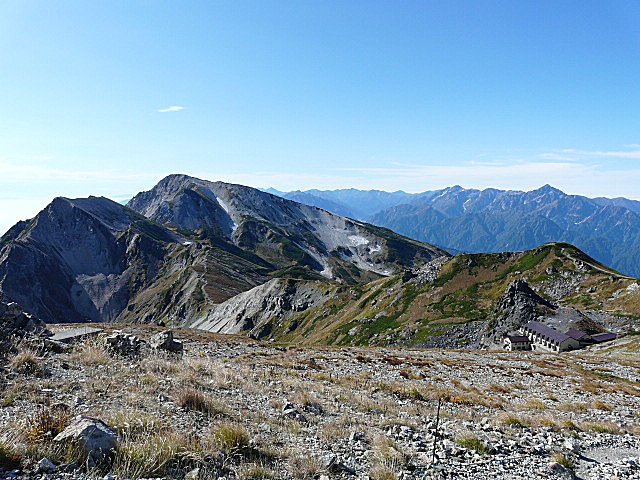 「初秋の杓子岳・白馬鑓ヶ岳と立山・剱岳と白馬山荘」(白馬岳にて)