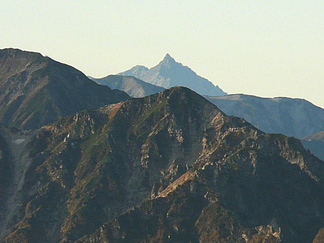 「杓子岳、奥には小蓮華山」(白馬鑓ヶ岳にて)